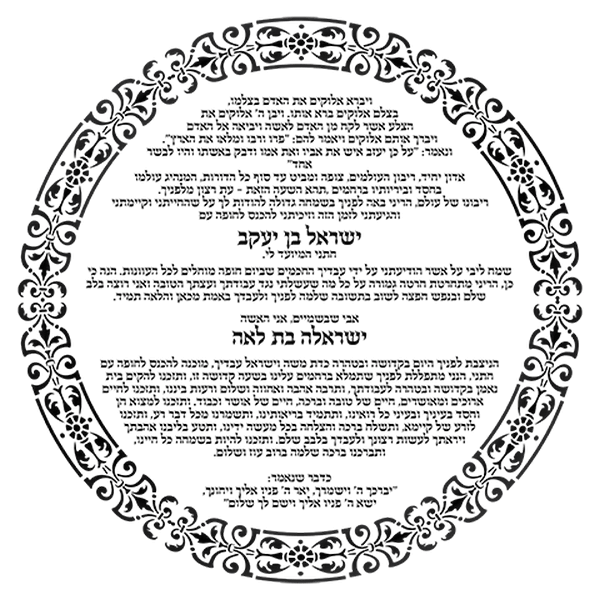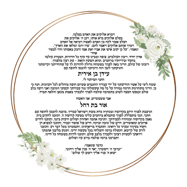 ברכת הכלה העגולה בעיצוב אישי מכילה אם שם הכלה ושם האמא של הכלה , שם החתן ושם האב של החתן.