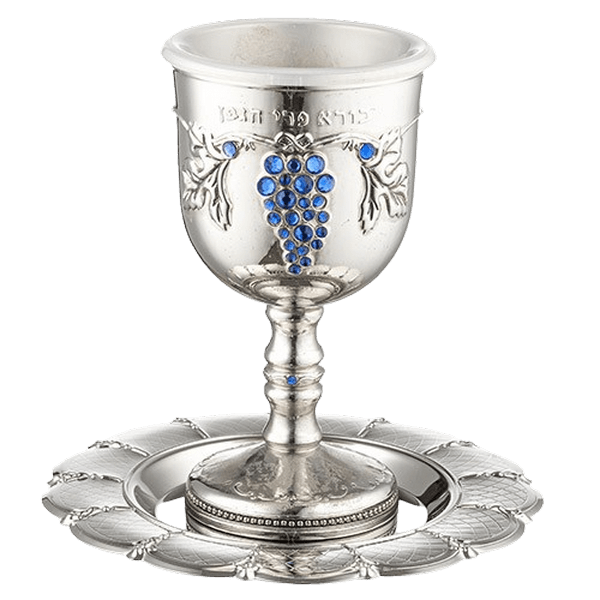 גביע קידוש דגם גפן שיבוץ אבנים כחולות כולל תחתית תואמת 13 ס"מ