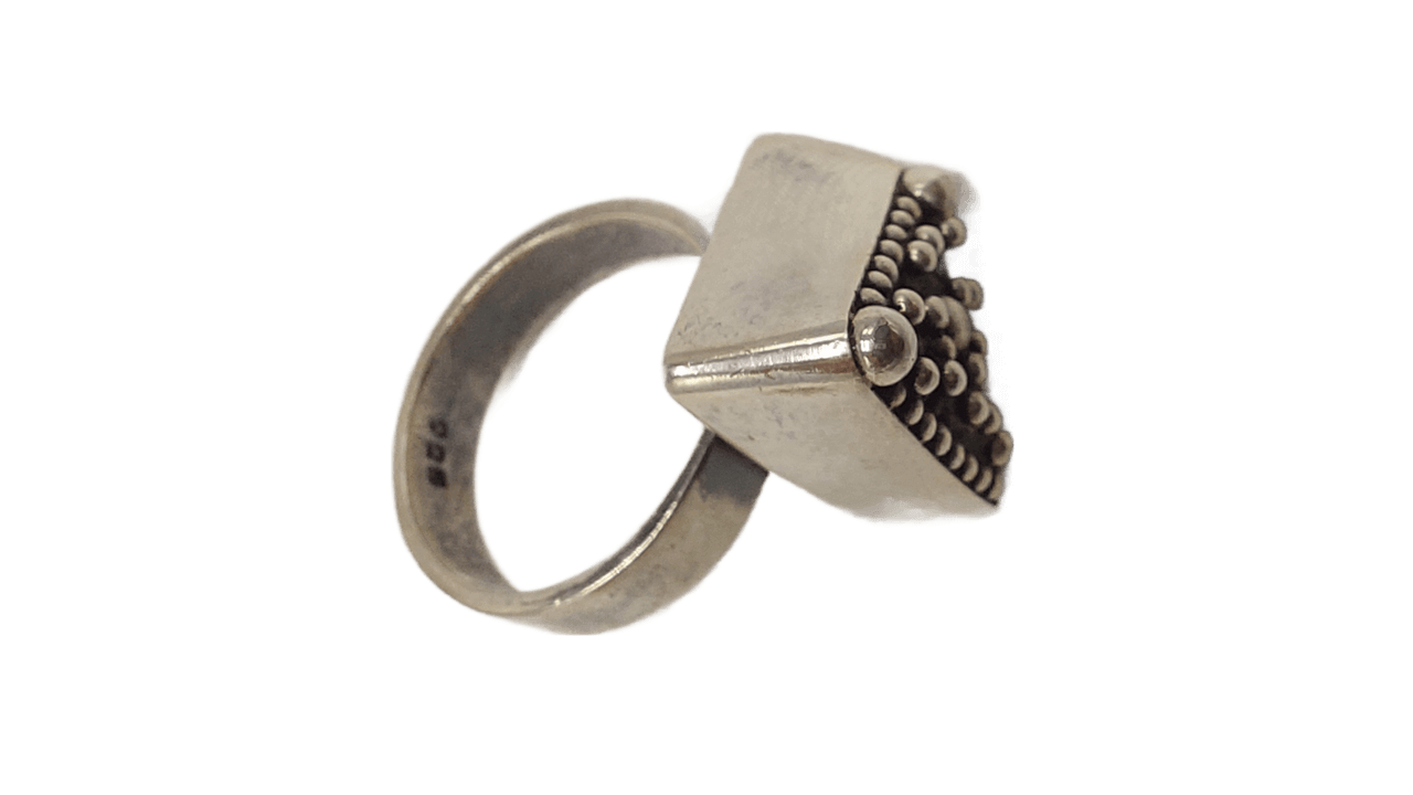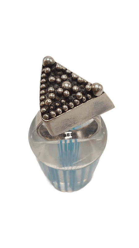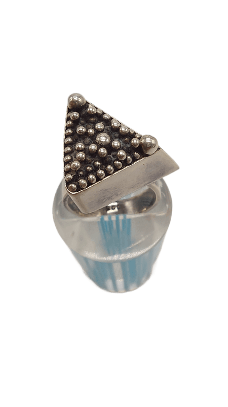 טבעת חותם בצורת משולש במילוי כדורי כסף קטנים שמוטבעים בתוך המשולש המקנה לטבעת מראה יחודי ועדין.