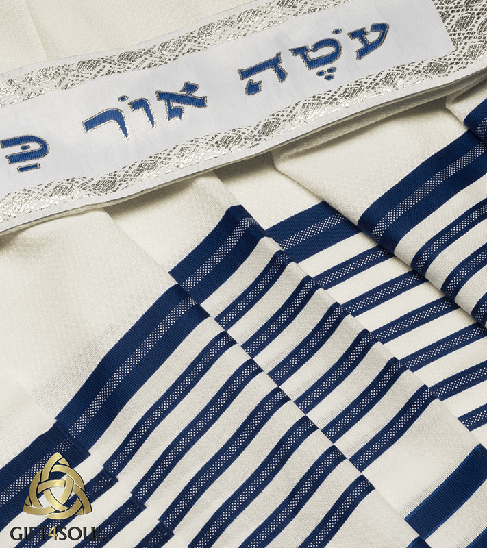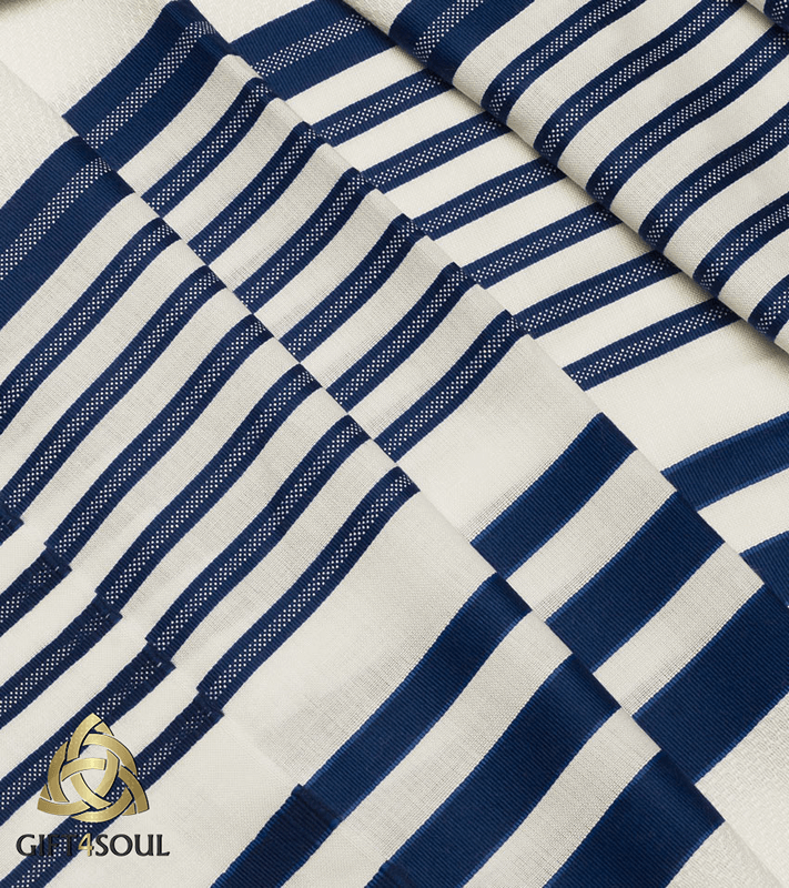 - טלית צמר אקרילן דגם אור טליתניה אריגה מיוחדת יוצרת בד בוהק עם חספוס קל עדין למגע משלב עטרה יוקרתית פסים כחולים