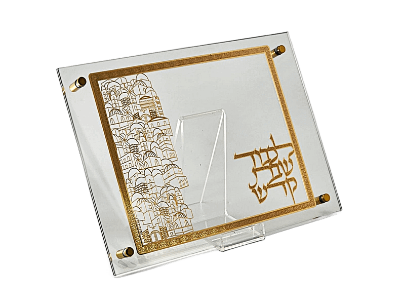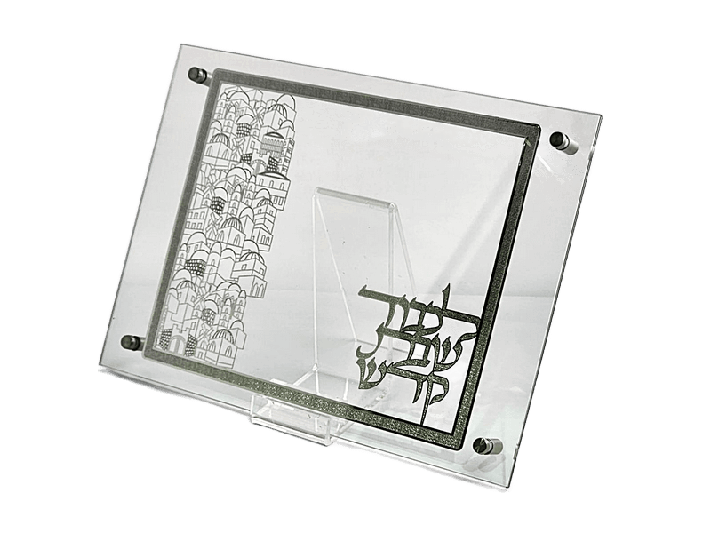 מגש חלה פלקטה שקוף מעוטר בבתי ירושלים טיפוסיים ובברכת שבת קודש.