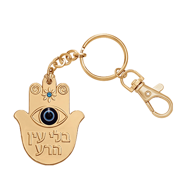 מחזיק מפתחות חמסה ניקל בגימור זהב כיתוב בלי עין הרע בחלק העליון אבן טורקיז