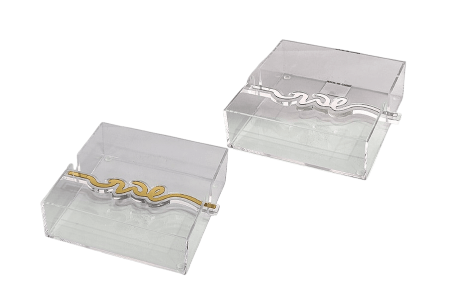 לשדרוג שולחן השבת והאירוח עם פריט מעוצב לשולחן השבת,מפיון אקריליק שולחני שקוף עם כיתוב "שבת" כסוף-מוזהב.