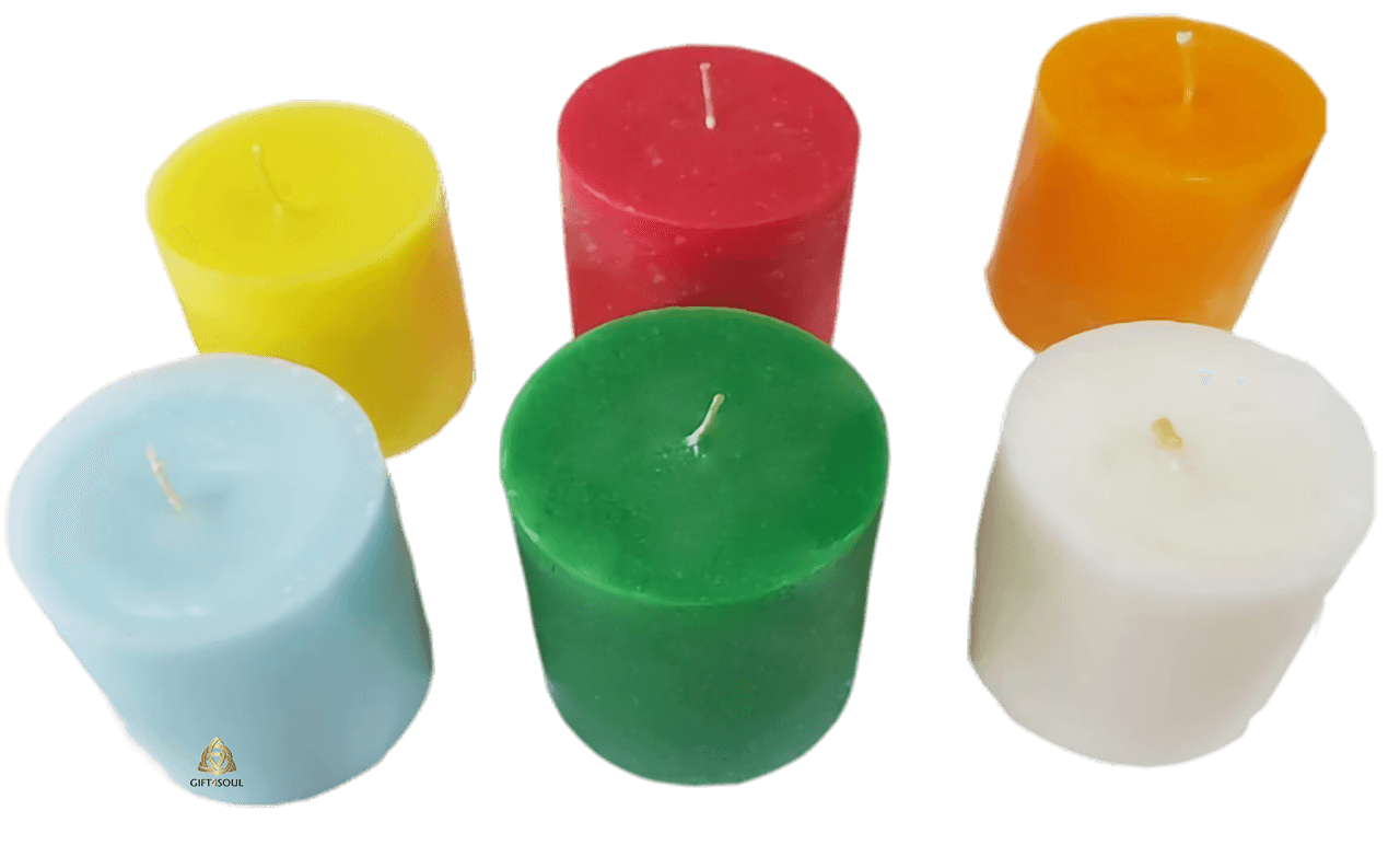 נרות עגולים בצבעים של לבן, צהוב, ירוק, אדום, תכלת וכתום.