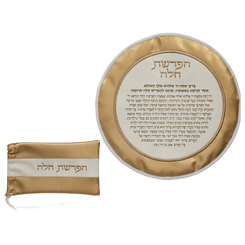 סט כיסויים יוקרתיים דמוי עור להפרשת חלה סט הכיסויים מכיל כיסוי עגול לבצק עם ברכת הפרשת חלה ונרתיק שמאחסן את הפרשת הבצק של הפרשת חלה.
