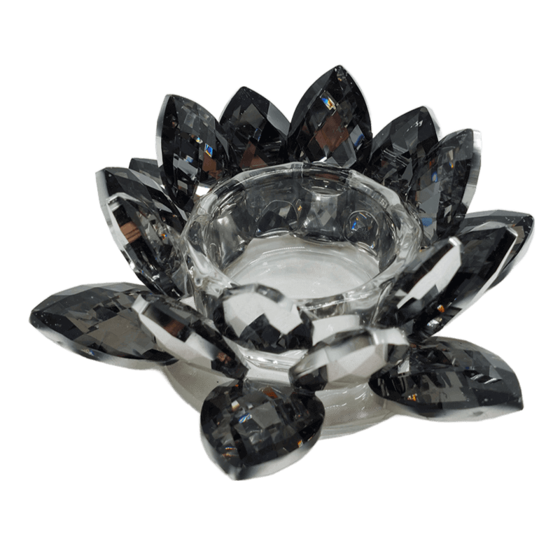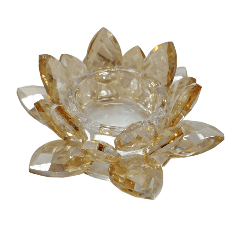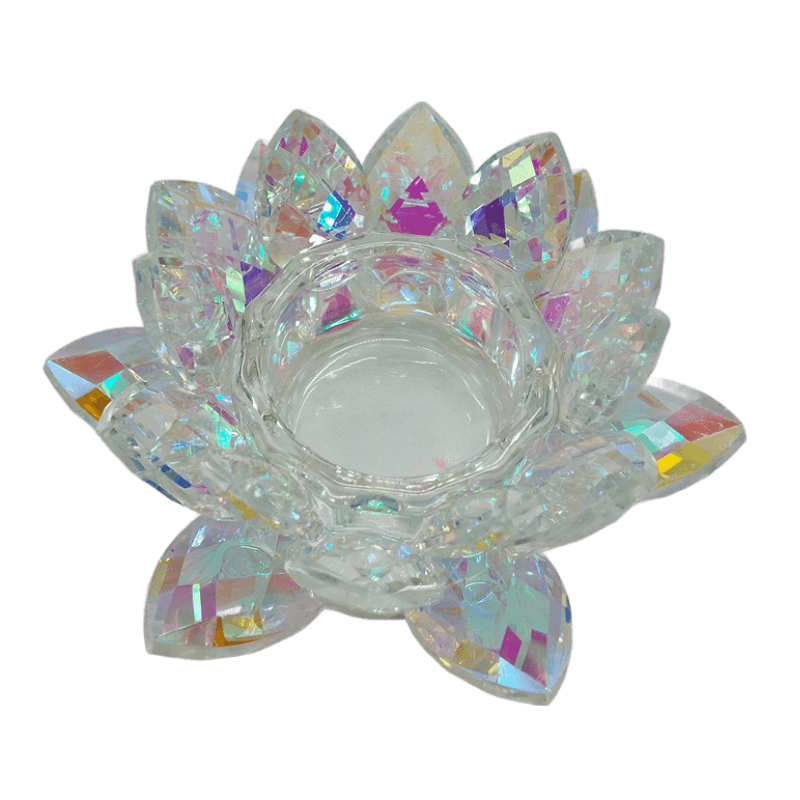 פמוטי לוטוס דקורטיביים בעיצוב פרח לוטוס מרהיב,עשויים חומר דמוי קריסטל מלוטש,המשמשים כפריט נוי ייחודי וכמפיצי אור קסומים.