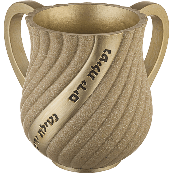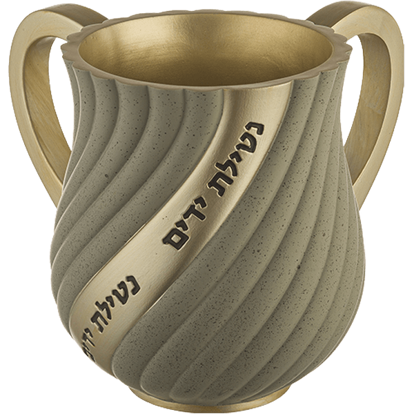 החלק העליון מסתיים בגימור גלי אצילי.במרכז הגוף המחוספס בולט פס זהב חלק ומבריק,עליו מופיע הכיתוב "נטילת ידיים" באותיות כהות וברורות.
