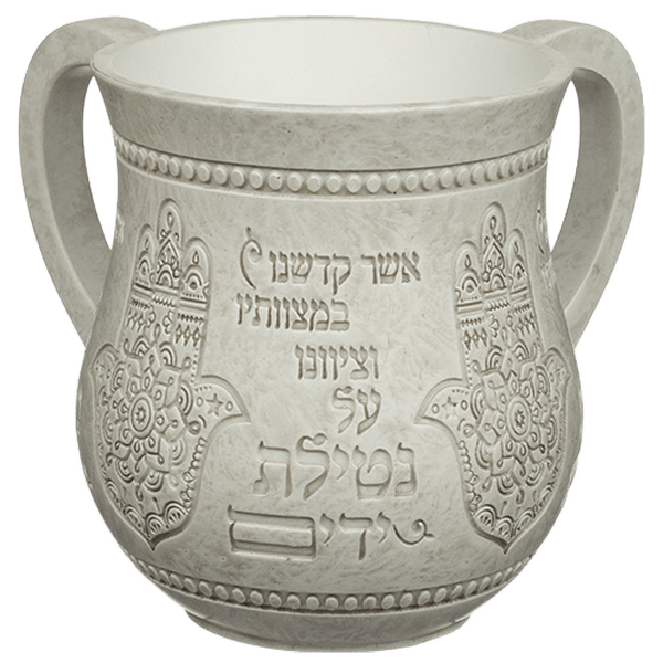 נטלה פולימר גוון חול אפרפר במראה אבן טבעית במרכז הנטלה חרוטה בכתב אמנותי הברכה "אשר קידשנו במצוותיו וציוונו על נטילת ידיים"