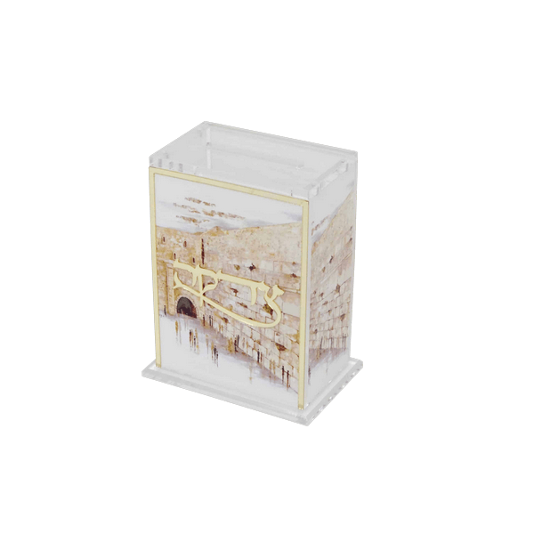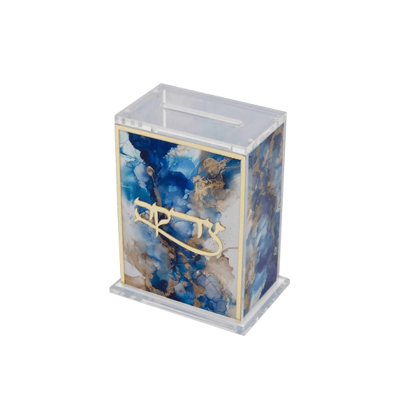 קופת צדקה אקריליק שקוף ואיכותי במבנה מלבני.,קופת צדקה דקורטיבית ומעוצבת, המשלבת מראה מודרני עם אלמנטים מסורתיים.